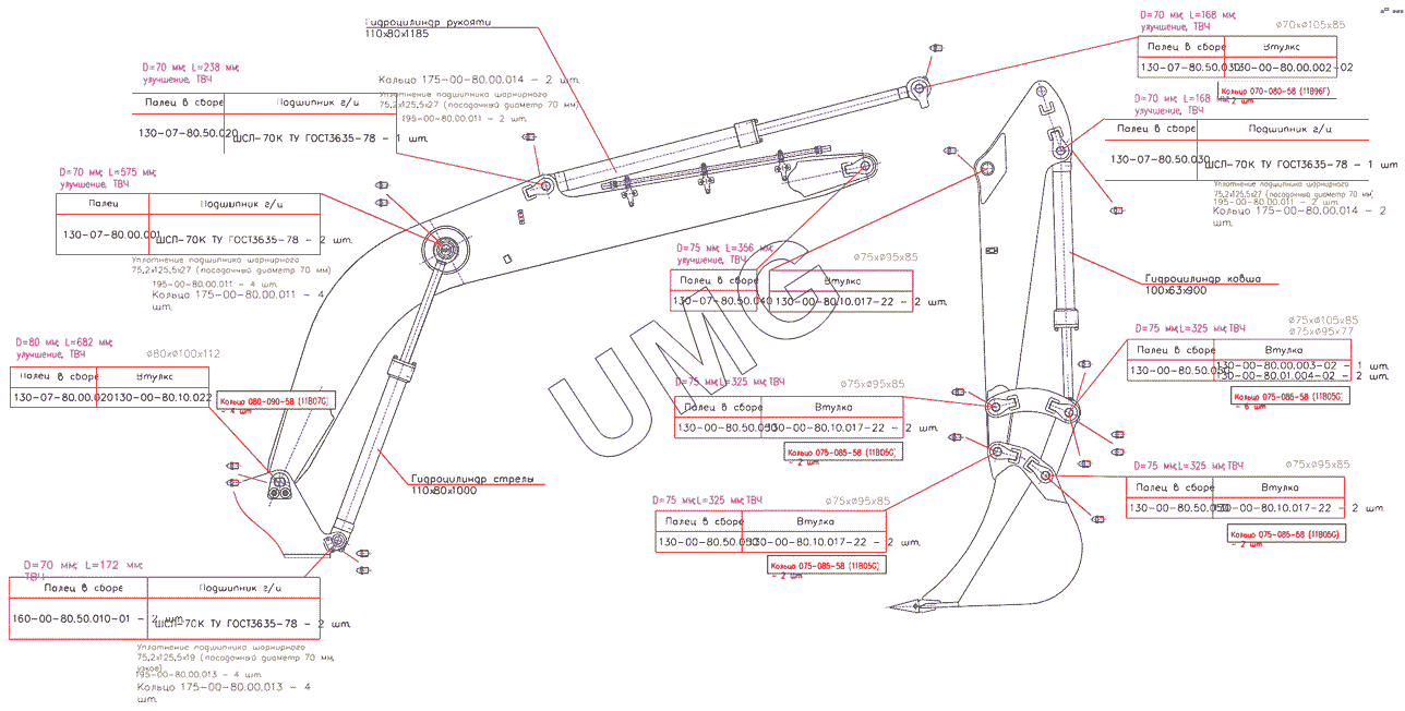 Блок-схема применяемости пальцев, втулок, уплотнений но икскайатор E—140W