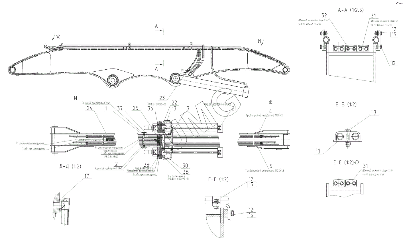 E230WH. Трубопроводы стрелы в сборе с гидроцилиндром