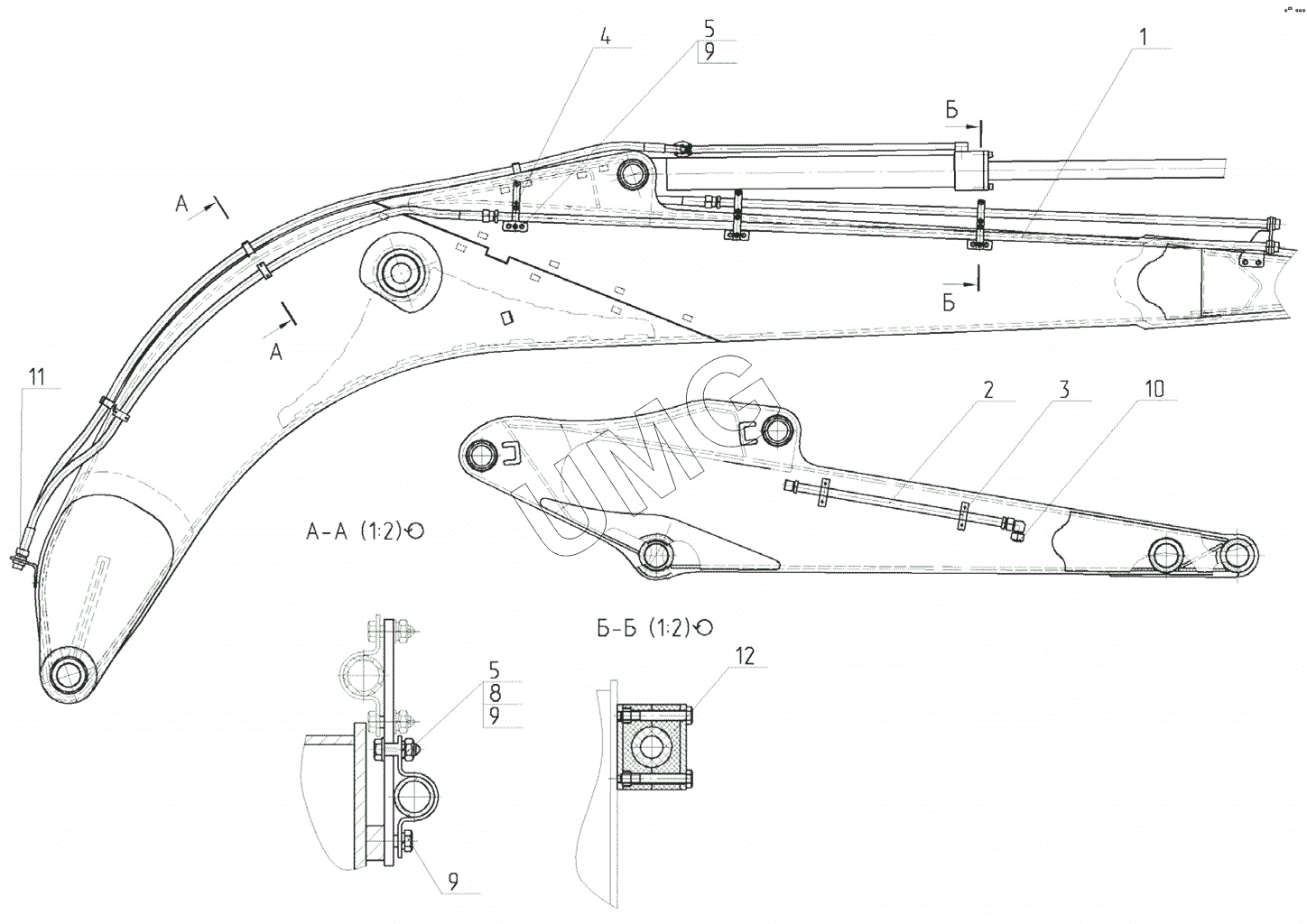 E240C. Трубопроводы гидромолота на рабочем оборудовании