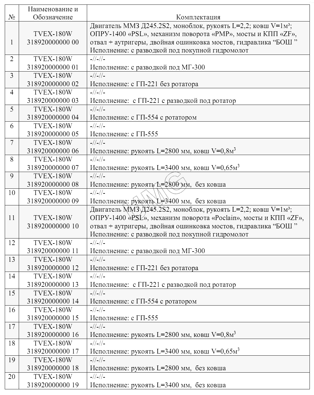 Базовое исполнение экскаваторов TVEX-180W