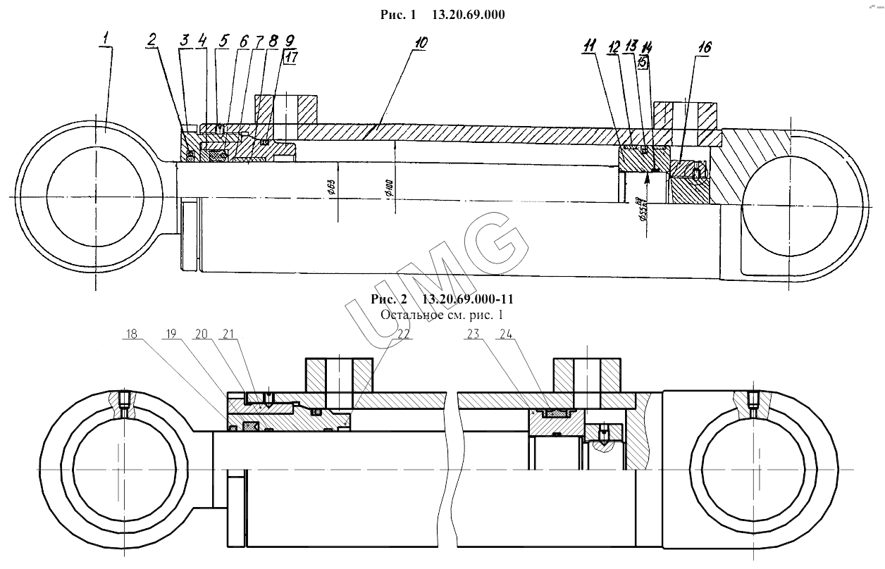 ЕК-18-20. 13.20.69.000 (100х63х250) Гидроцилиндр опоры-отвала (с уплотнениями «Элконт»), 13.20.69.000-11 (с уплотнениями «ГидраПак»)